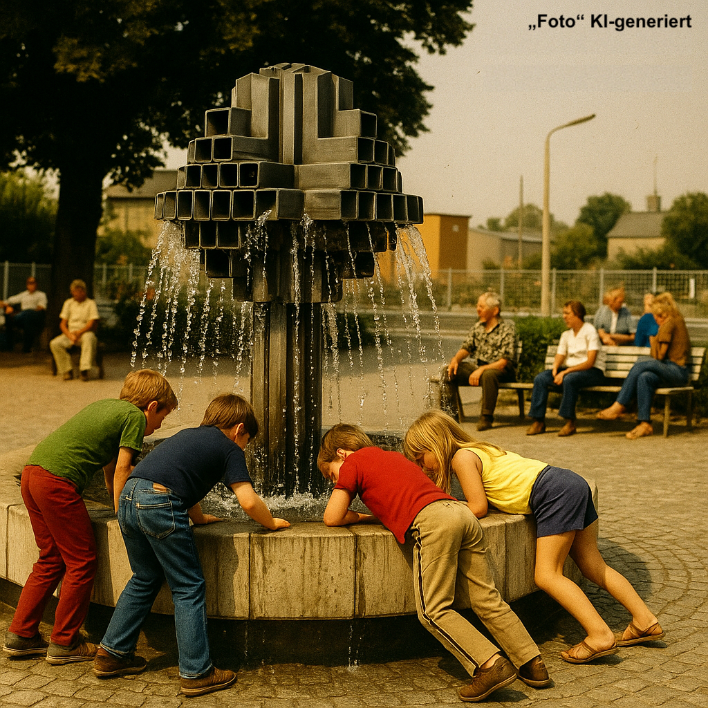 Der Schaum der Einheit – Wie ein Gaselan-Brunnen Geschichte, Glanz und Blödsinn vereint. Heute wenig beachtet, früher Magnet für Kinder und Erwachsene. Letztere tranken gemütlich ein kühles Blondes in der „Einheit“, während die Kinder beschäftigt waren.